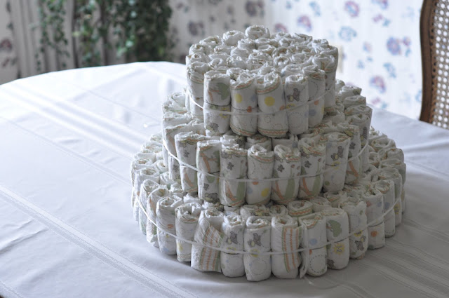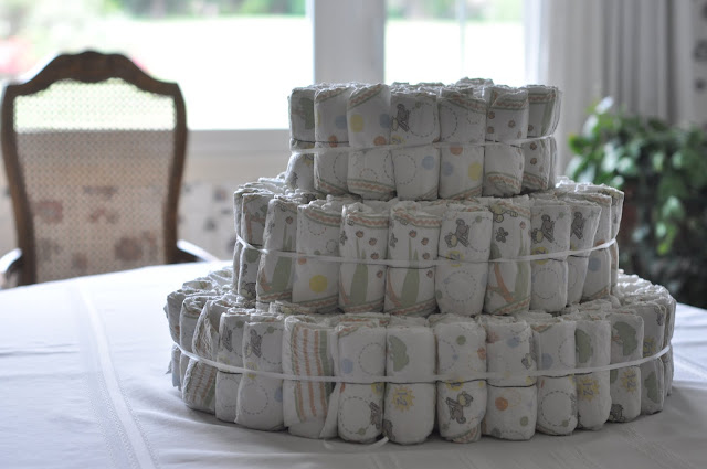 "DIAPER CAKE!" I shouted into the phone. Because I love them. About two years ago, I threw my friend a baby shower and made my first diaper cake then. The picture I have of it isn't that great.
