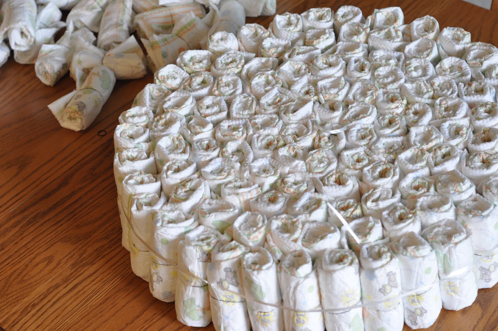 For the base, we tied six rolled diapers in a circle with curling ribbon. Then we added another layer of rolled diapers around that and tied it again. We did that a bunch of times until we had a huge circle.