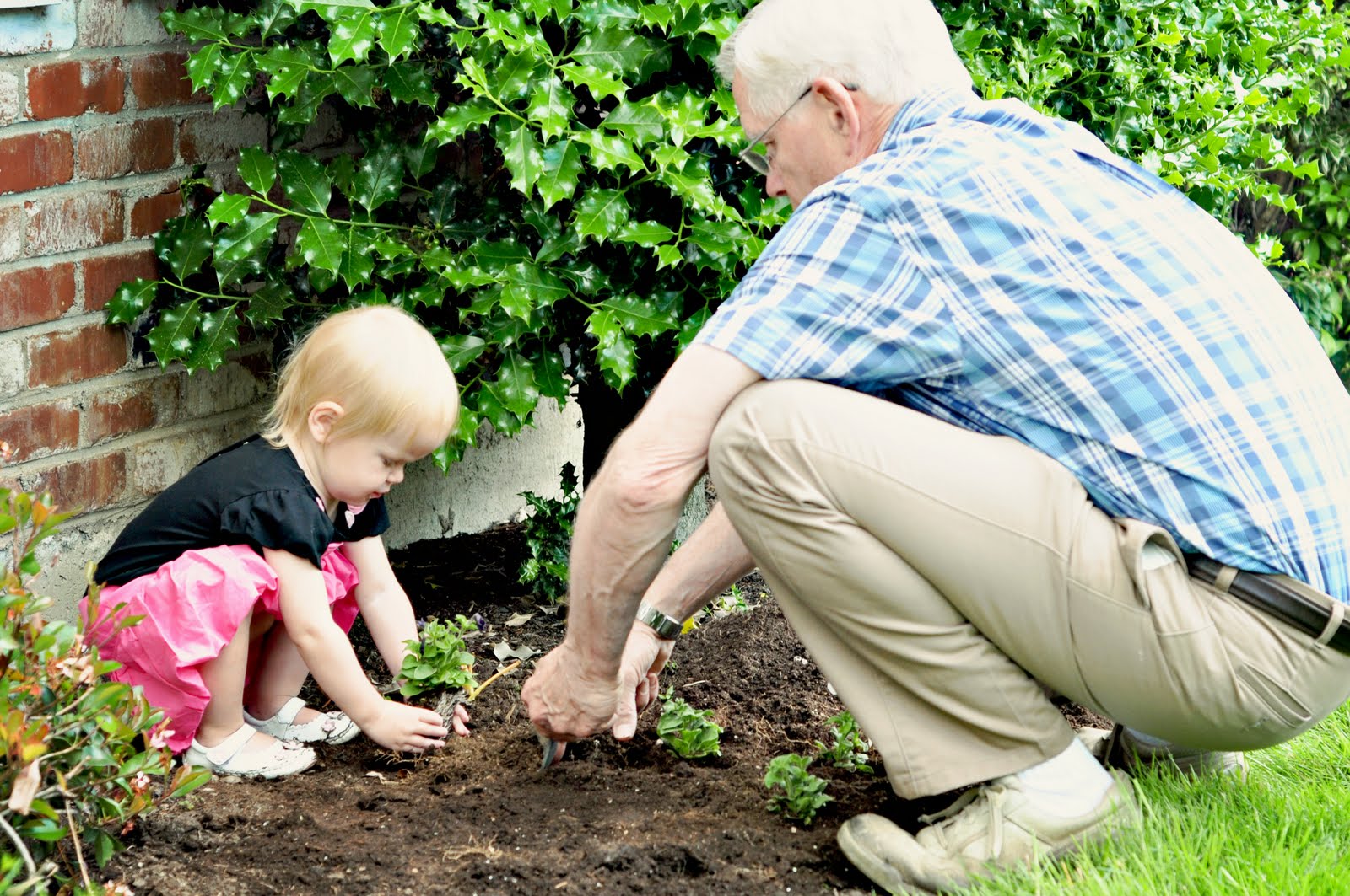 I've improved my technique a bit since then and Dave's mom Becky and I had fun putting it together on her dining room table. While we worked, Grandpa taught Annalise how to garden.